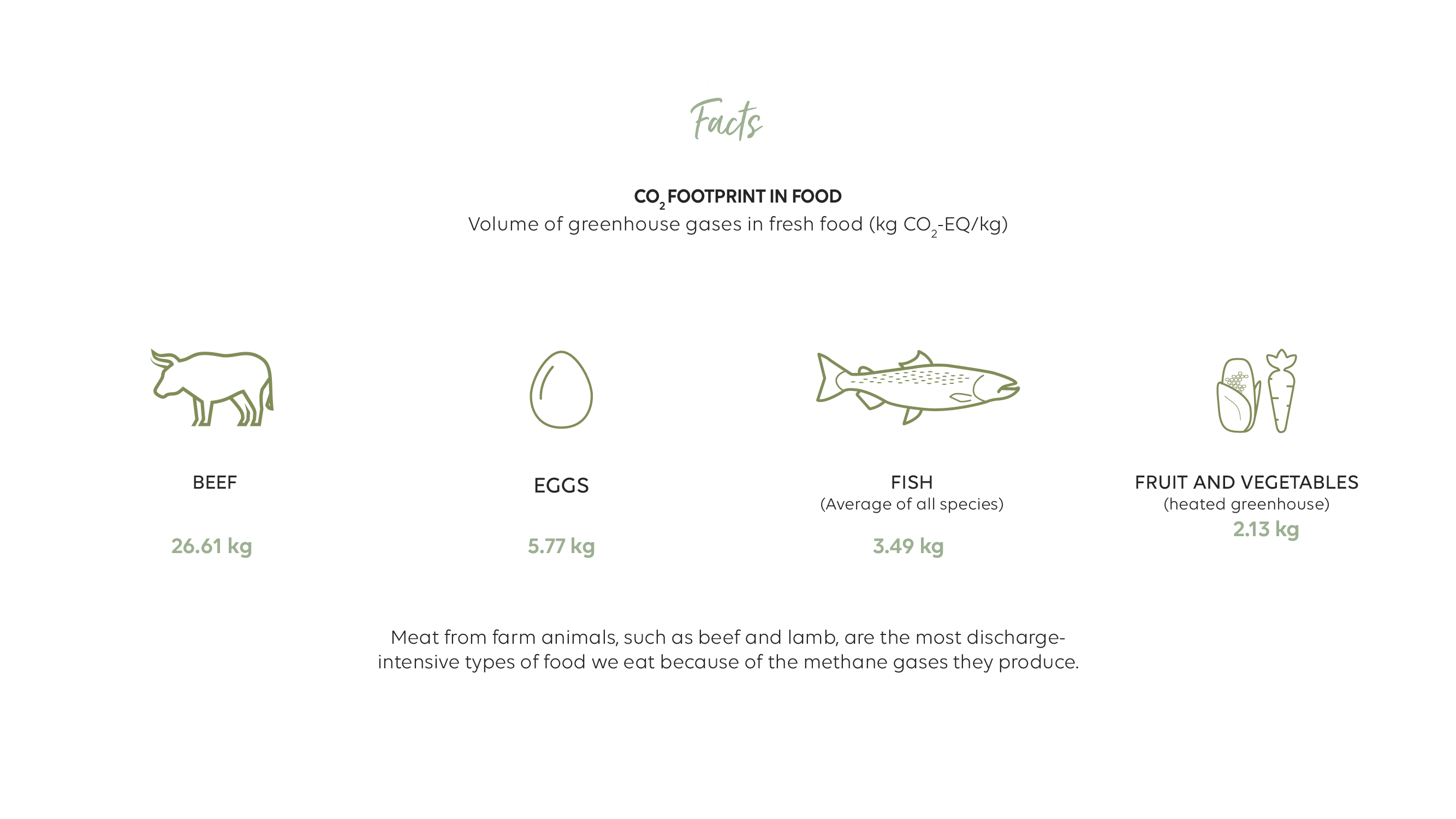 The CO2 footprint of Fish (average) is about 3,49 kg Co2-EQ/kg compared to beef at 26,61 kg Co2 -EQ/kg. Farmed Atlantic salmon have even a lower Eco fotprint of 3,3 kg co2 – EQ/kg (Ref: Sintef 2017).