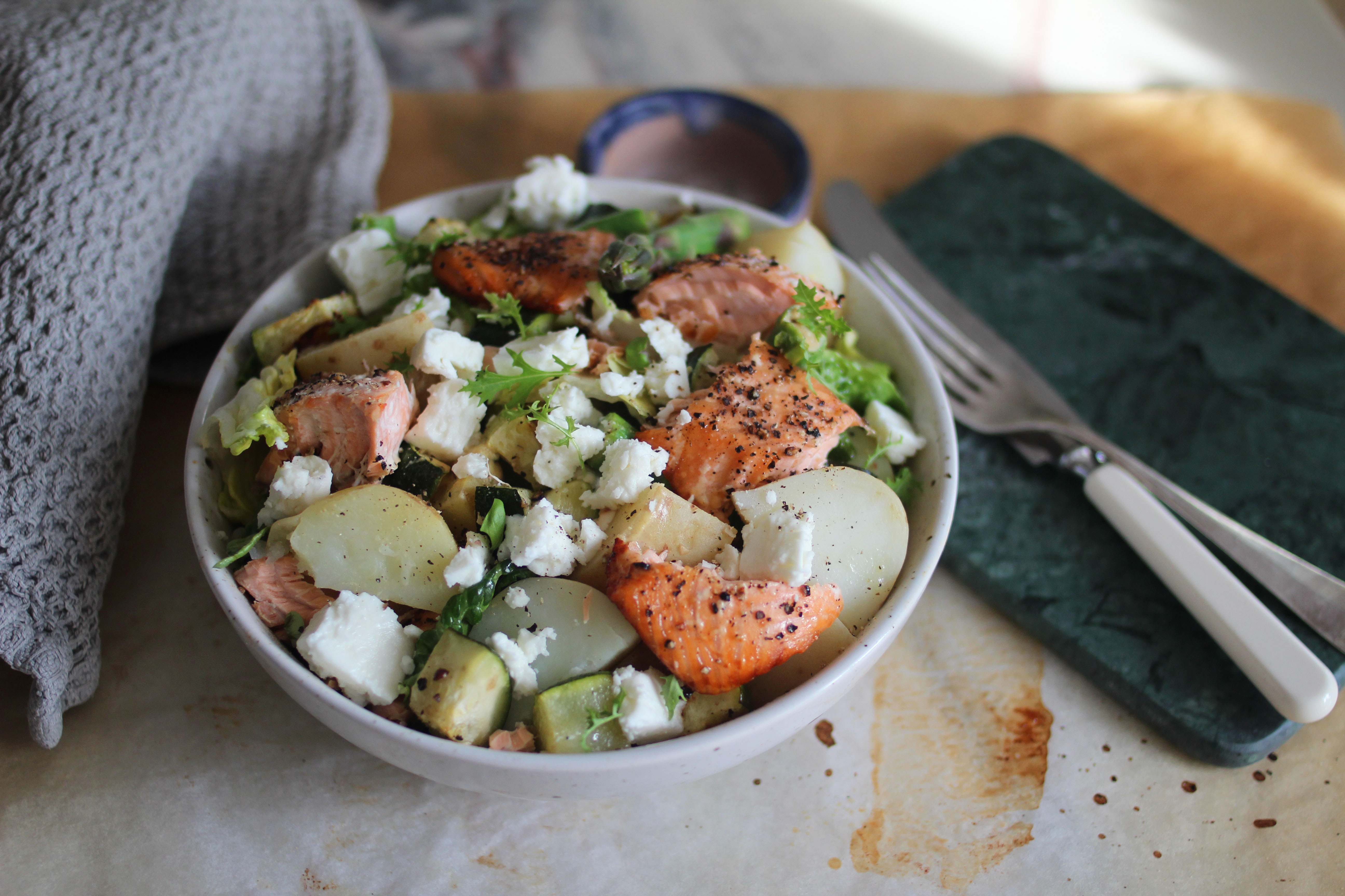 Salmon with asparagus and warm potato salad