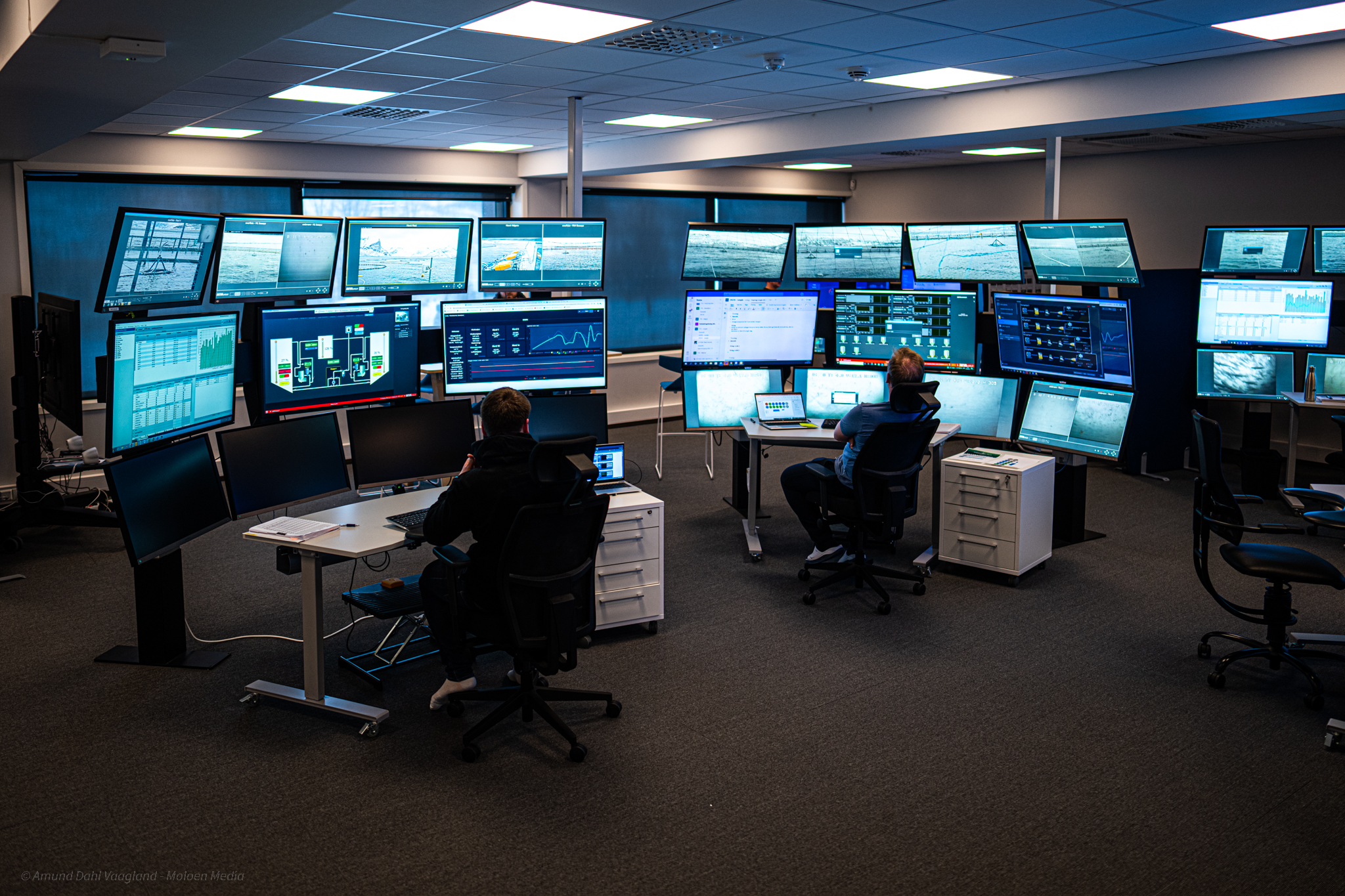 På et tilvekstsenter sitter driftsoperatører og kontrollerer at fisken i merdene får mat. Alt gjøres ved fjernstyring, og ved hjelp av teknologi jobber de med å optimalisere fôringen.