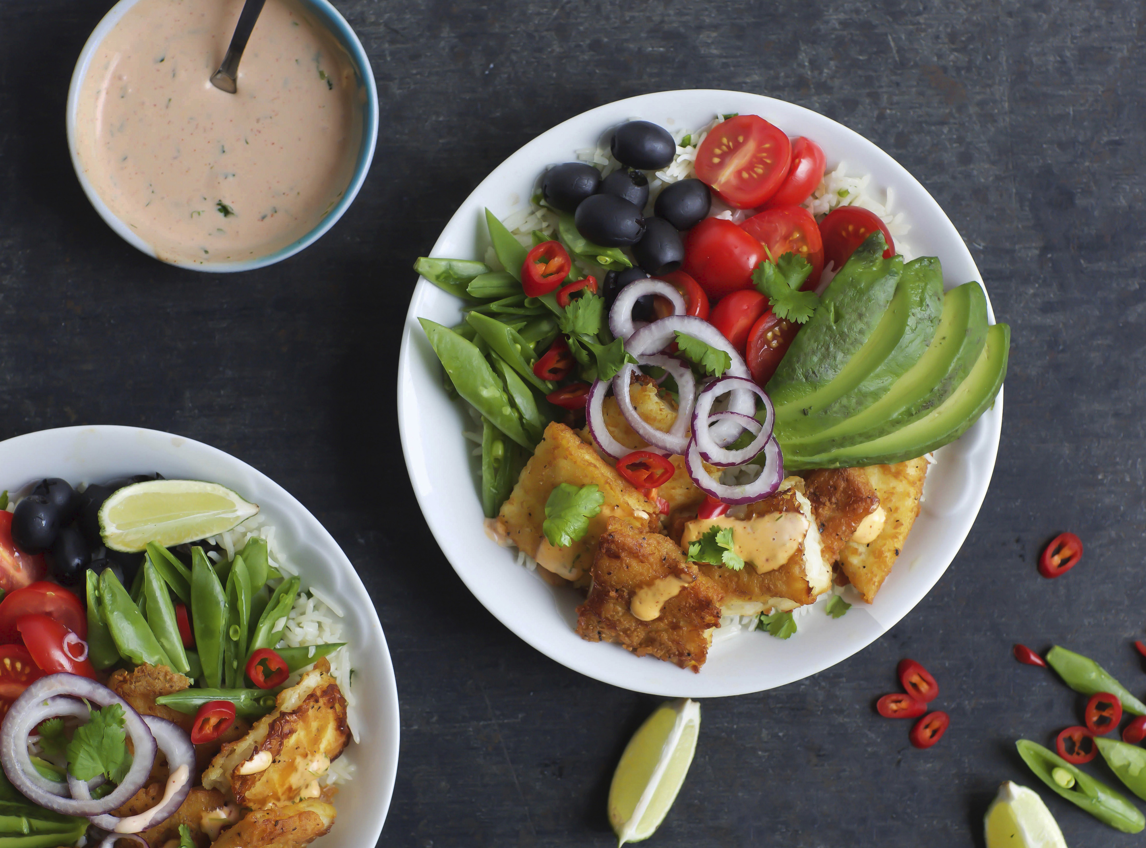 6. Fyll skåler med rismiks. Del den panerte fisken i store terninger, og ha disse over risen sammen med oppkuttede grønnsaker. Topp med chilimajones.