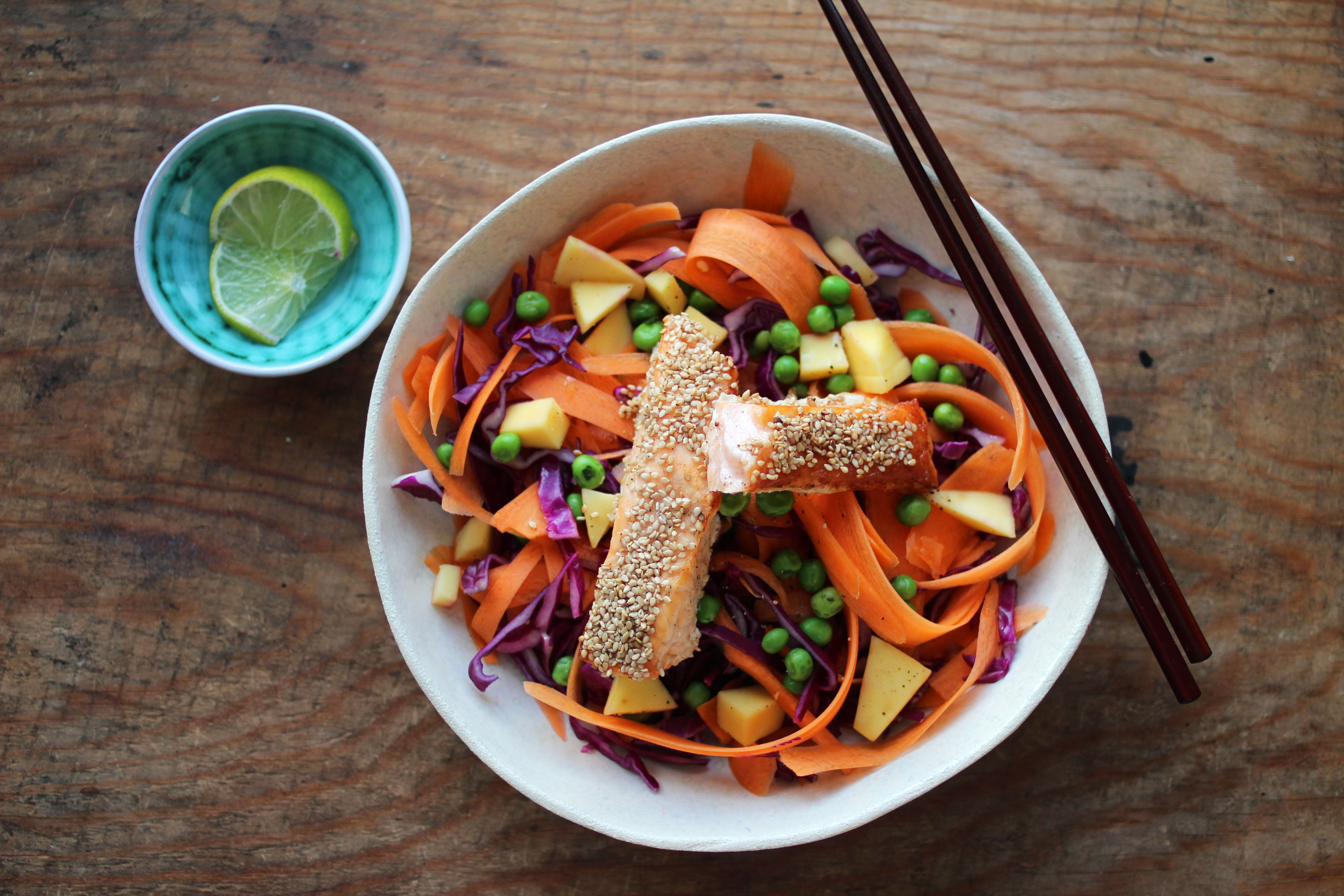 Fremgangsmåte på laks med sesamfr og nudler: