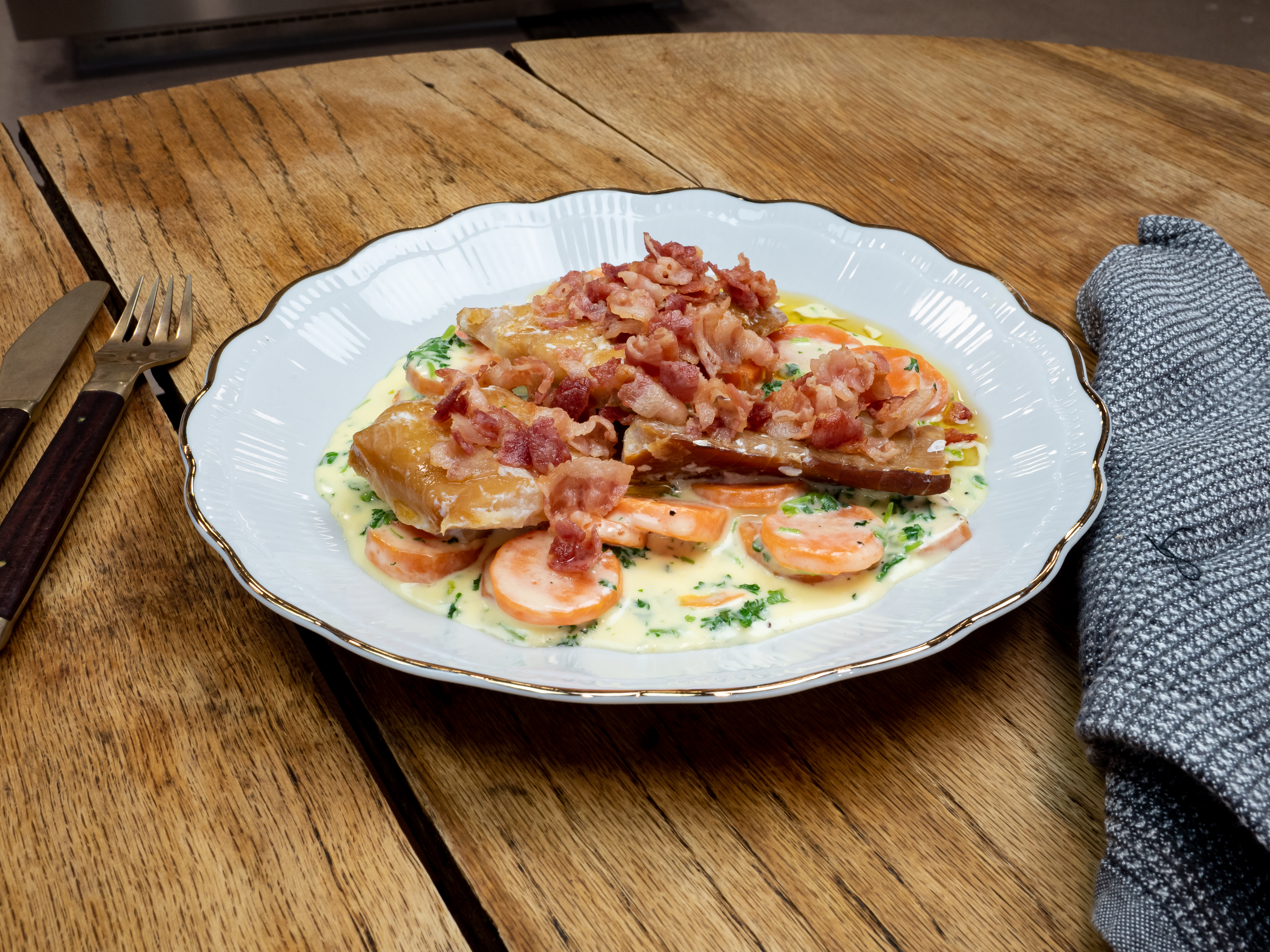 Røkt torsk med gulrotstuing og baconsmør